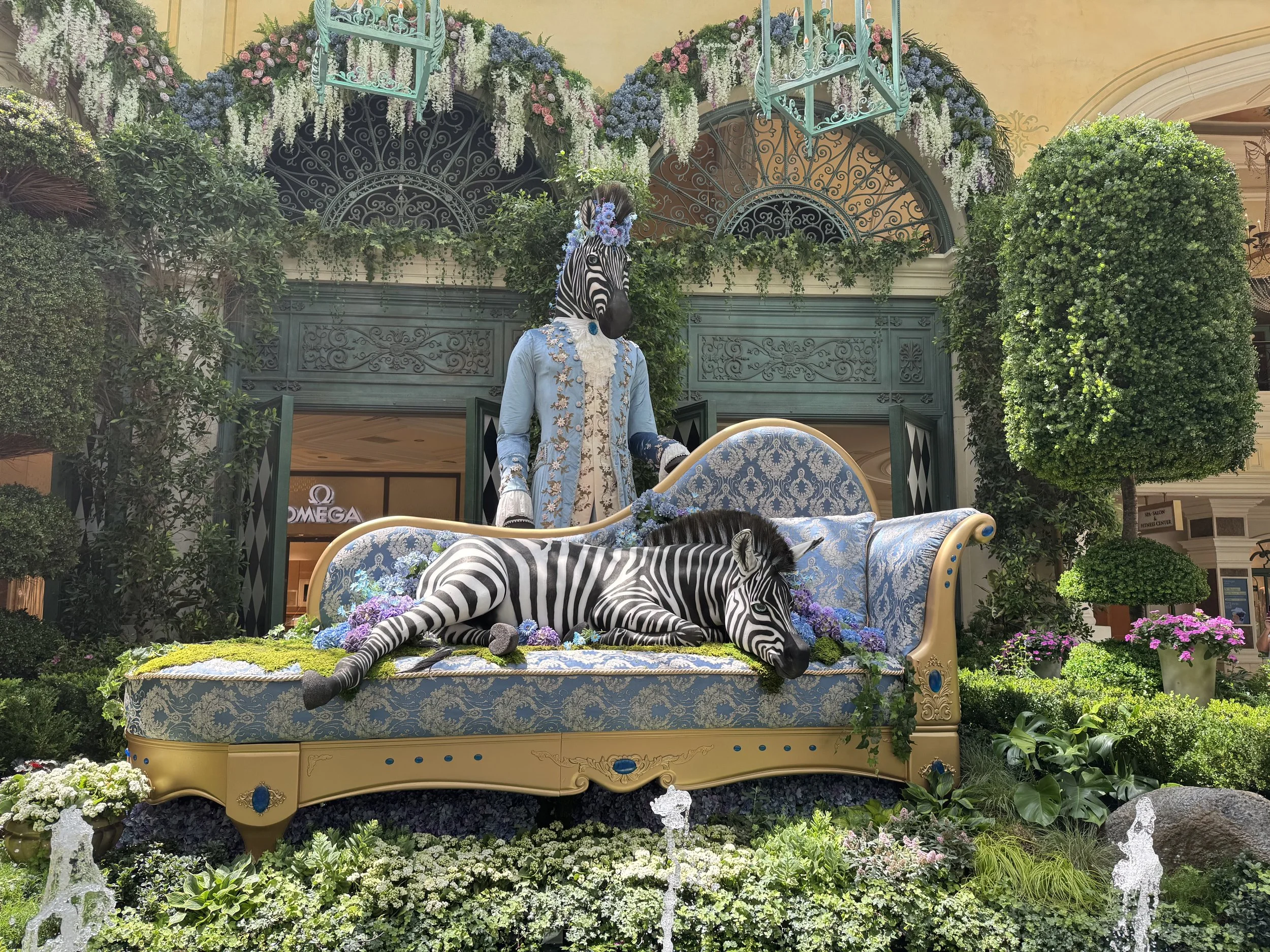 The Bellagio Conservatory and Botanical Gardens change into different imaginative spaces several times throughout the year. The current summer 2025 theme, Glam Menagerie: A Surrealist Summer, transforms the 14,000-square-foot space into a whimsical world of animals and chess.